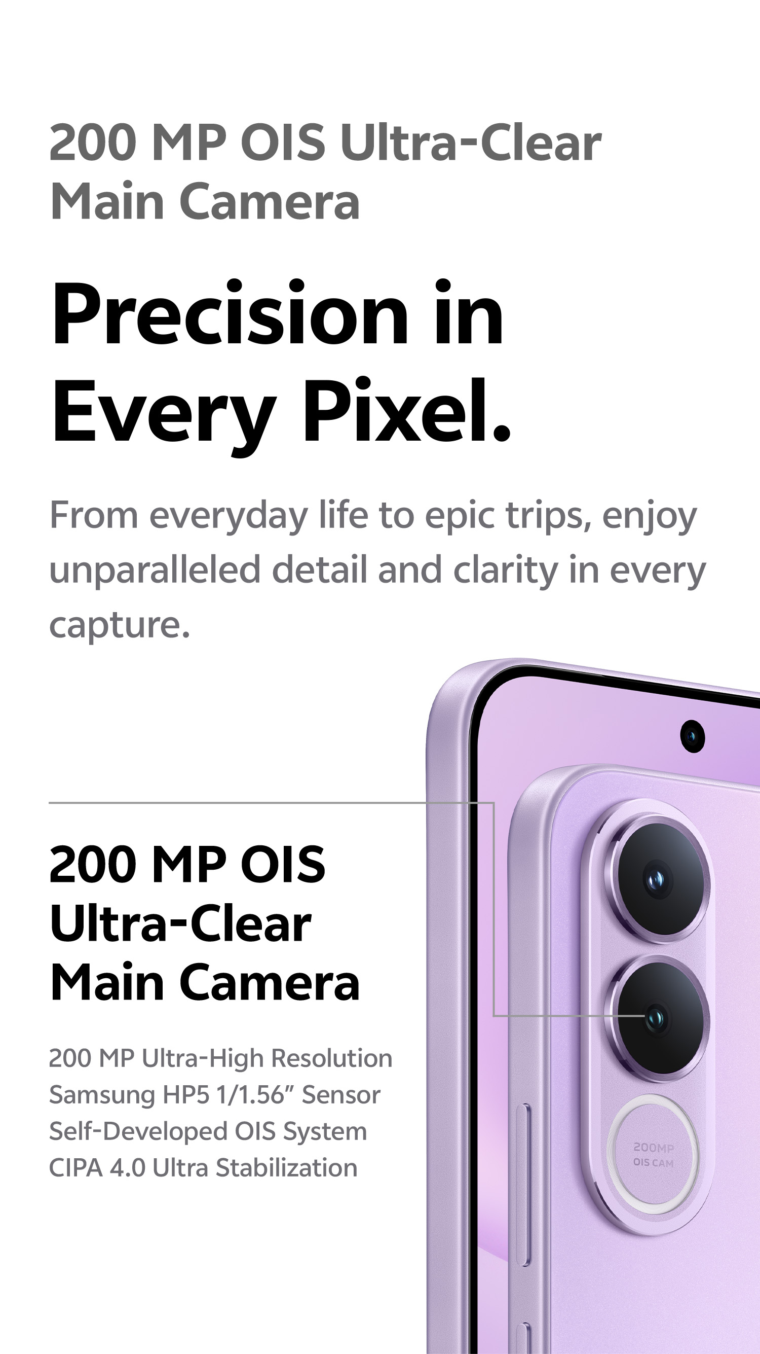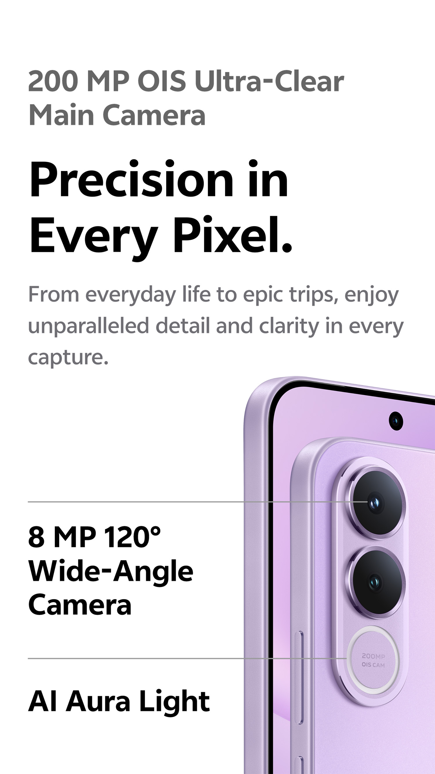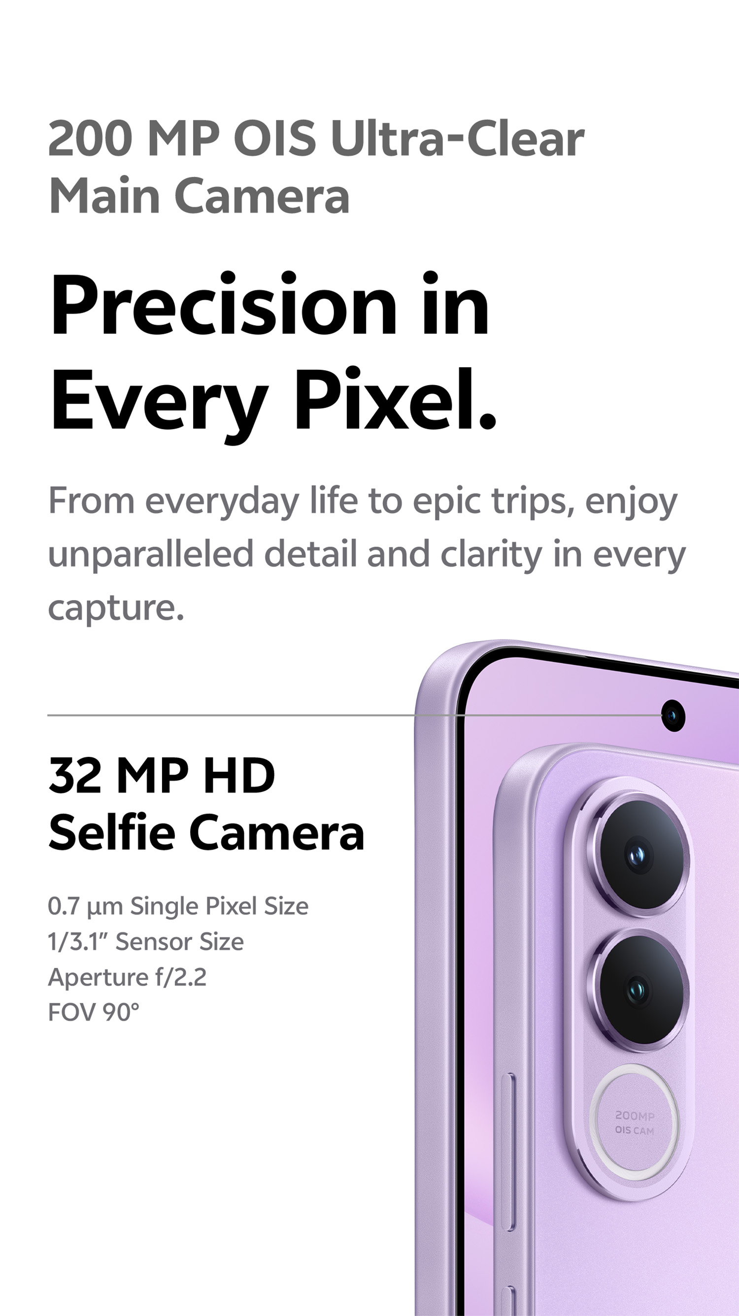 200 MP OIS ultra-clear main camera: supports AF, f/1.88; a FOV of 84°; 6P lens 8 MP 120° wide-angle camera: supports FF, f/2.2; a FOV of 120°; 5P lens