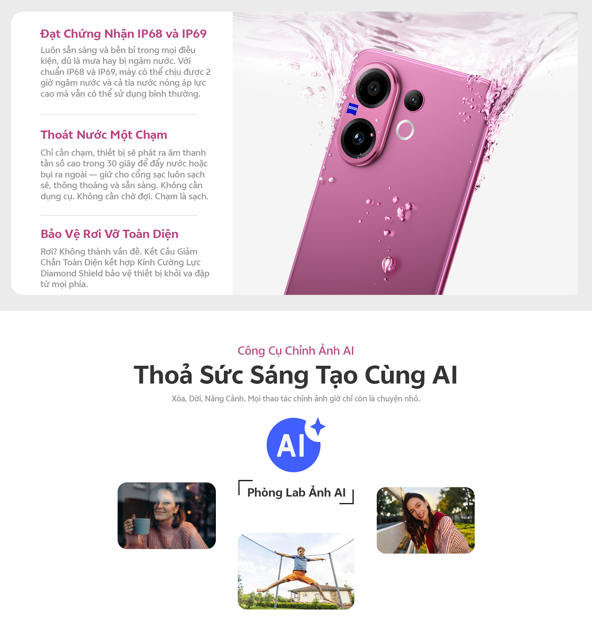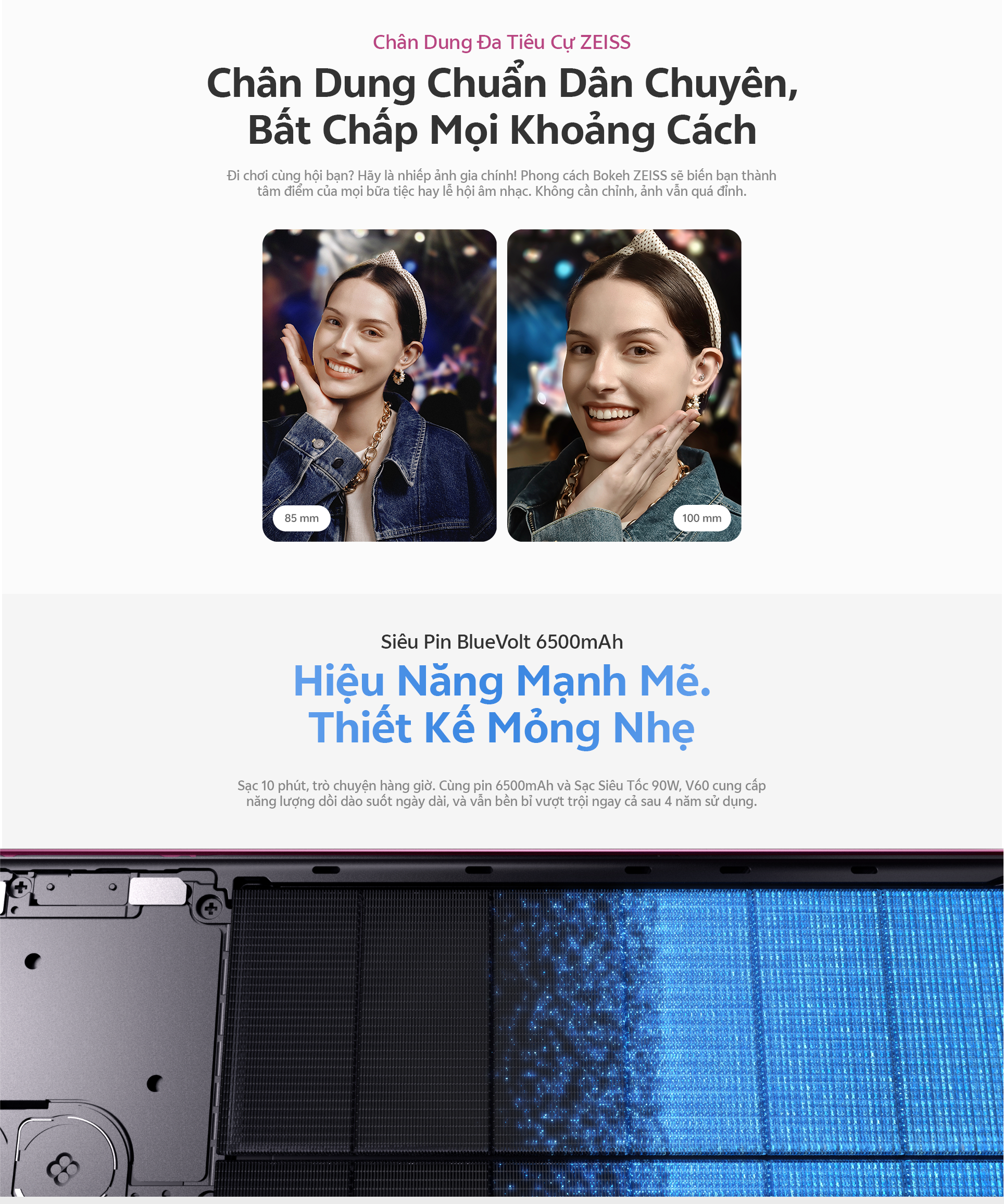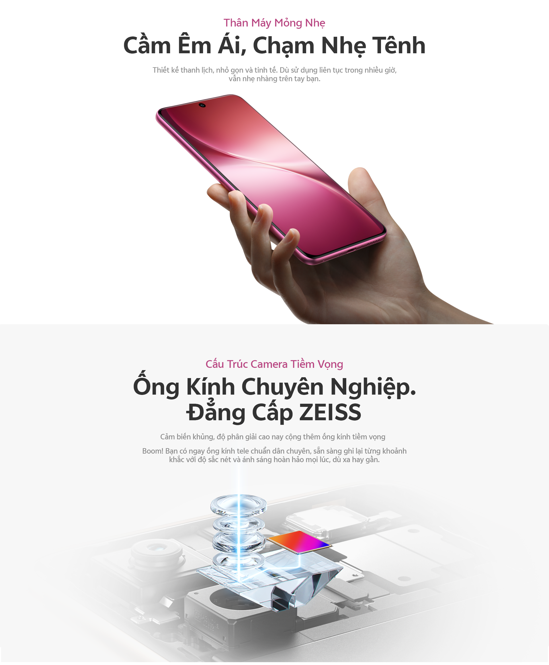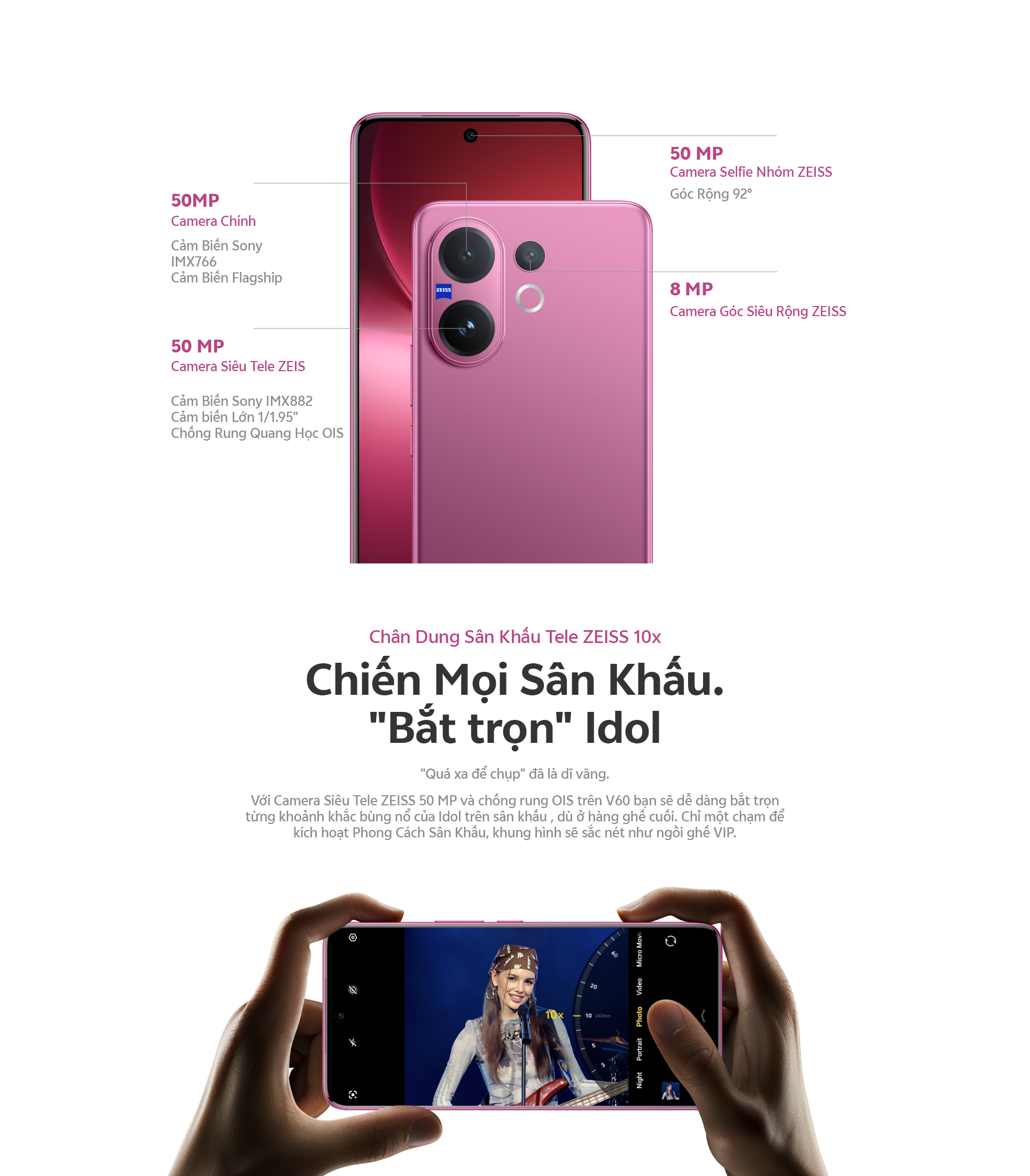 Camera chính ZEISS OIS 50MP: hỗ trợ OIS, f/1.88, FOV 84° ± 3°, ống kính 6P Camera siêu tele ZEISS 50MP: hỗ trợ OIS, f/2.65, FOV 33.1°, ống kính 4P Camera góc siêu rộng ZEISS 8MP: f/2.0, FOV 120° ± 3, ống kính 5P
